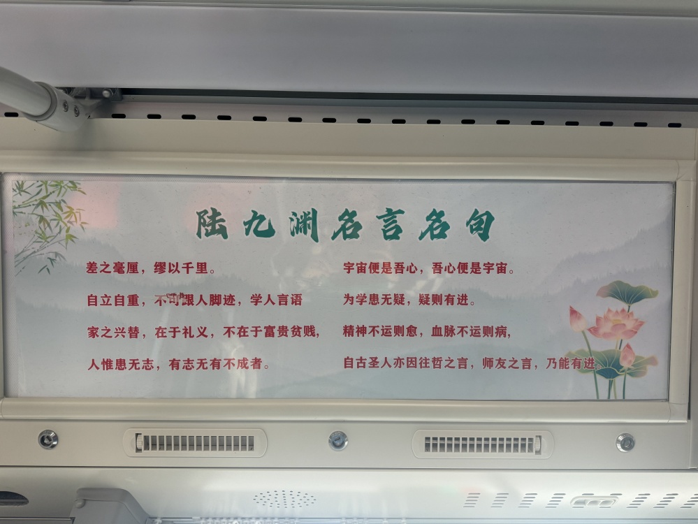 “陸九淵號”不僅僅是一條公交線路,更是一個移動文化陣地。當你踏上這趟公交車,你會被駕駛員的熱情服務所感染,他們微笑著迎接每一位乘客,以優(yōu)質的服務彰顯著荊門的文化精神和城市溫度。車輛全部采用新能源公交車,不僅環(huán)保節(jié)能,行駛起來也更為平穩(wěn),同時,在車輛內外裝飾以及“進站、出站、溫馨提示”等場景語音播報融入陸九淵相關元素,讓乘客潛移默化的加深對荊門文化的認識和理解。