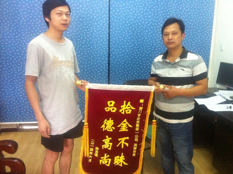 6月18日上午,失主陳先生從公汽一公司負(fù)責(zé)人的手中認(rèn)領(lǐng)到丟失的錢包時,心情十分激動,經(jīng)他現(xiàn)場清點,包內(nèi)6000元現(xiàn)金等物品一樣沒少,認(rèn)領(lǐng)時他還特地為吳師傅趕制了一面"拾金不昧 品德高尚"錦旗表示謝意。