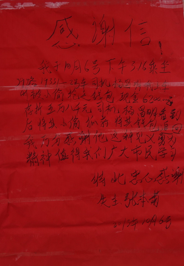 就在大家為這名錢包被偷的女子惋惜時,一名穿紅色T恤、黑色褲子的男子趁亂穿過馬路匆匆離開,坐在后排的一位乘客再也忍不住,大喊起來:"我看到就是他偷的!"此時,紅T恤男子已經(jīng)朝金龍泉大道啤酒廠方向走去。司機楊昌明見狀,立即開門,跳下駕駛室邊追邊大喊"站住"。聽到喊聲,紅T恤男子撒腿就跑,楊昌明和兩名熱心乘客緊跟著追去。眼見楊昌明和兩名熱心乘客越追越近,紅T恤男子將一個紅色錢包丟在了地上,楊昌明將錢包撿起后沒再追趕。當(dāng)楊昌明返回車上,女失主卻已經(jīng)不見了,在一車乘客的見證下,楊昌明打開錢包,發(fā)現(xiàn)錢包內(nèi)有6200元現(xiàn)金和一些存款單。為了不耽誤車上的乘客出行,楊昌明暫時將錢包保管,驅(qū)車離開。